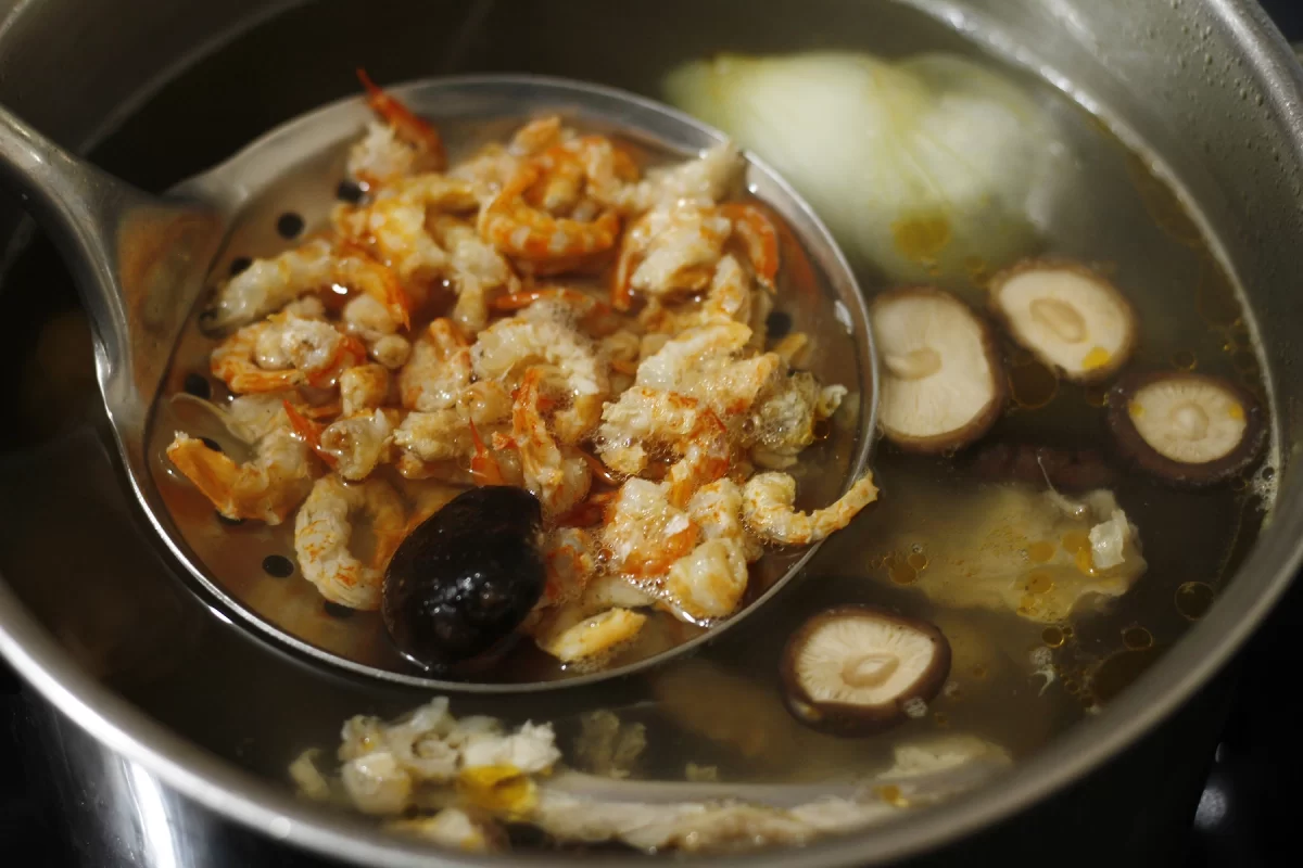 The soul of Bun Thang is its delicate yet deeply flavorful broth. Unlike the robust beef broths of phở or the pungent fermented broths of bún riêu, Bun Thang’s base is subtly aromatic and crystal clear.